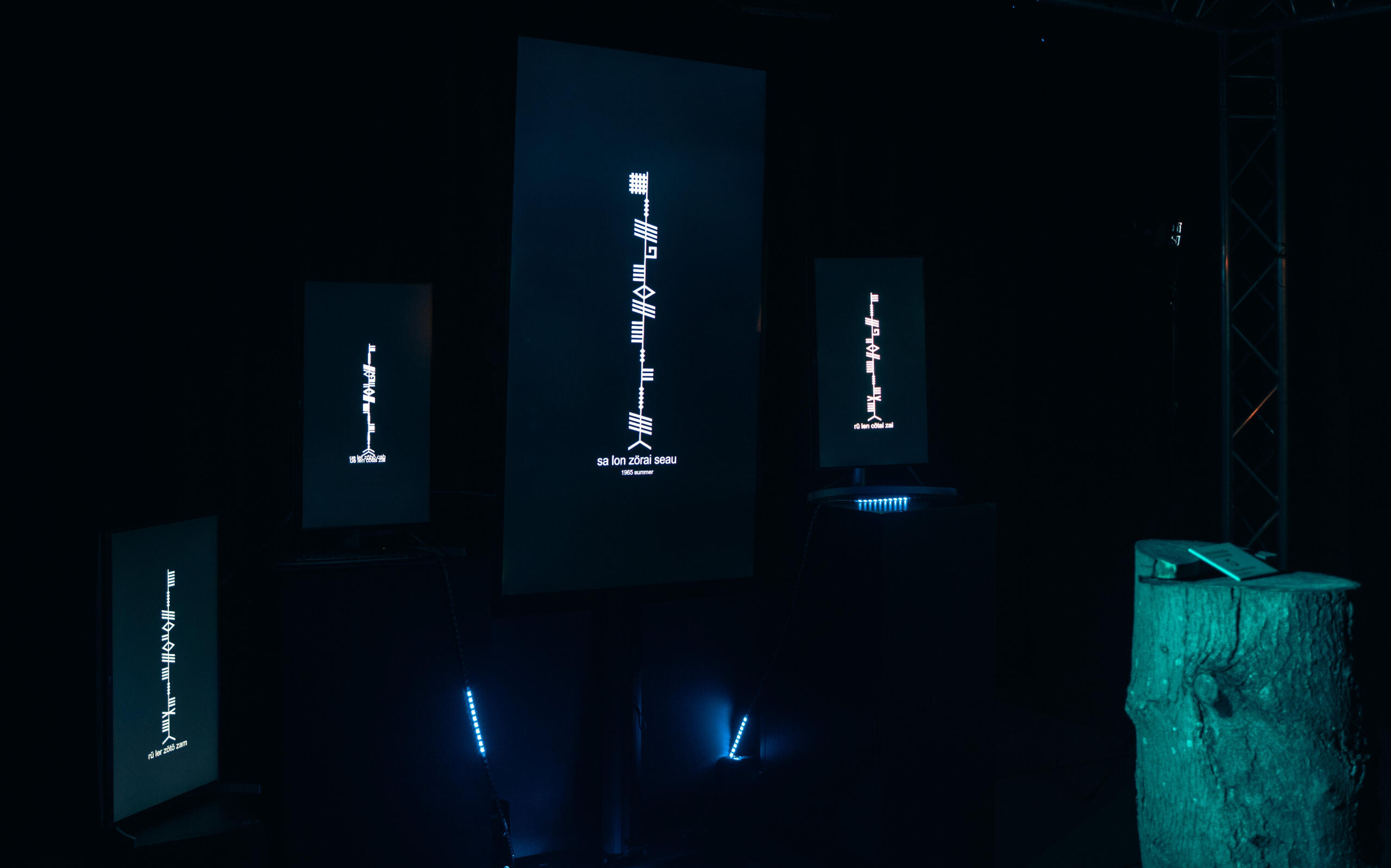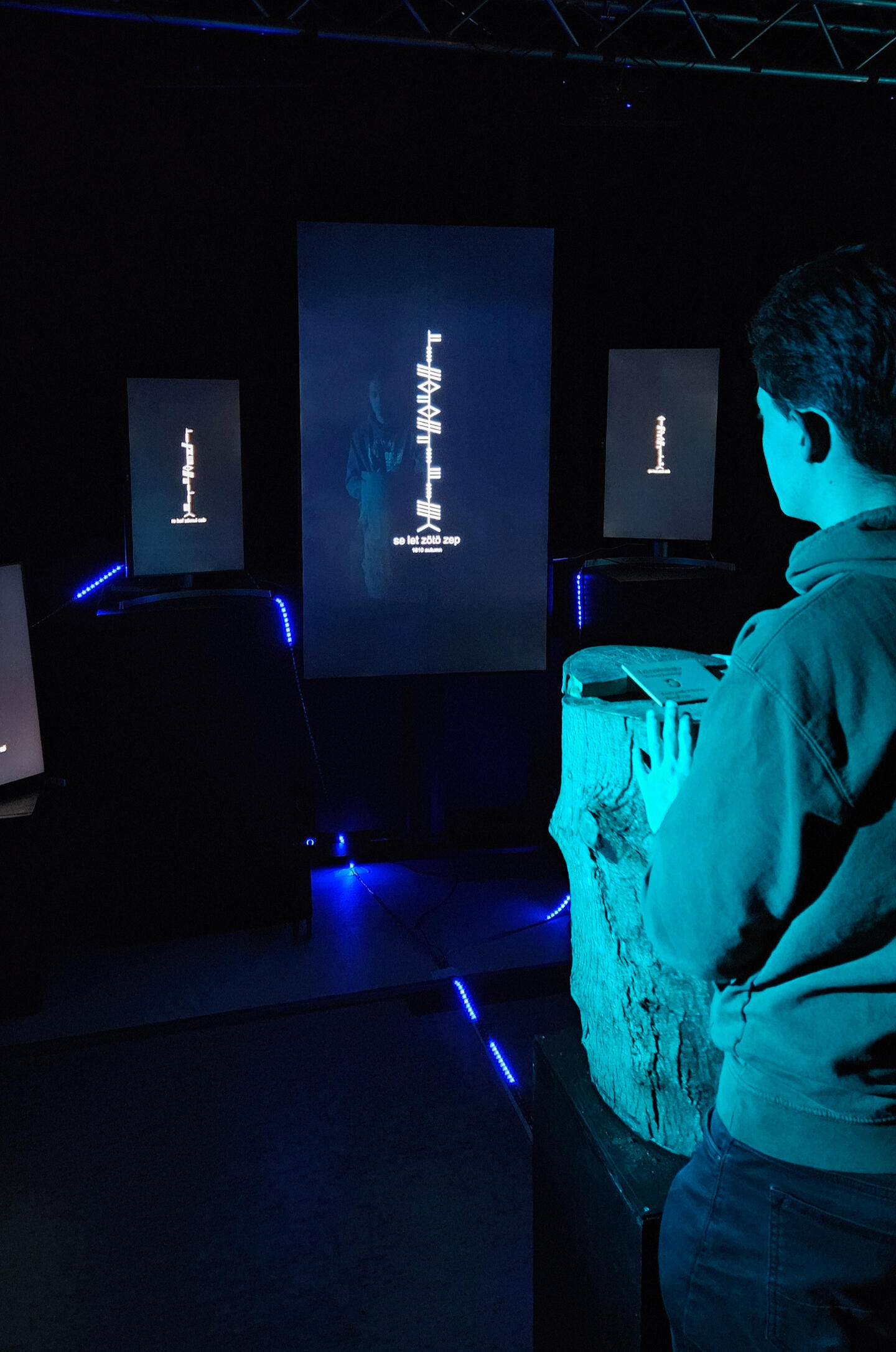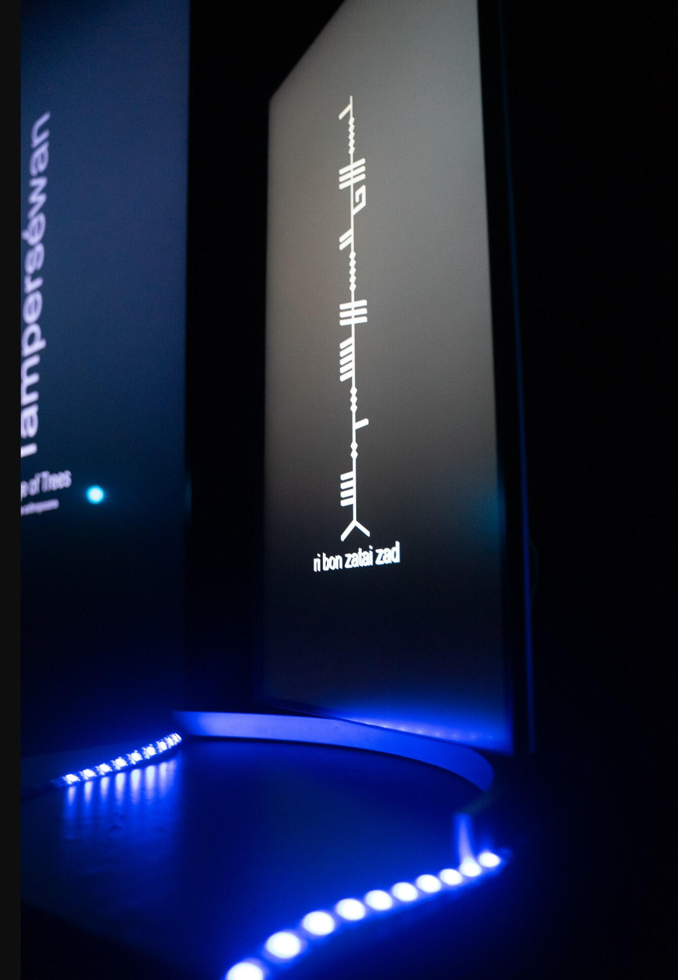Lotkísèm, the installation in its totality, is conceived as a museum exhibit dedicated to showcasing this constructed language as if it were a relic of folklore. The exhibition is designed to immerse visitors in the world of Lotkísèm, with one side featuring displays where the language's structure and nuances can be studied and learned. Across the room, multiple screens dynamically present the language, weaving narratives of various trees within an abstract forest setting.Lotkísèm, in its essence, is enigmatic or ambiguous¹. Comprising numerous layers of storytelling and linguistic metaphysics, the installation invites users to enter a realm of curiosity and awe. This sense of wonder ignites an interest in understanding the workings of this language system, prompting users to decide whether to delve into the cultural narrative of a tree’s life or simply interact with it and observe how the words evolve over time. Ultimately, the experience culminates in users becoming more engaged and immersed, deepening the sense of wonder with which they initially entered the installation.The main story the installation tells is one about a deceased tree that stood firm in the Mastbos in Breda for almost three centuries. Data gathered from various institutes such as KNMI and Climate Data were used to create story in the words told by this old beech tree.
